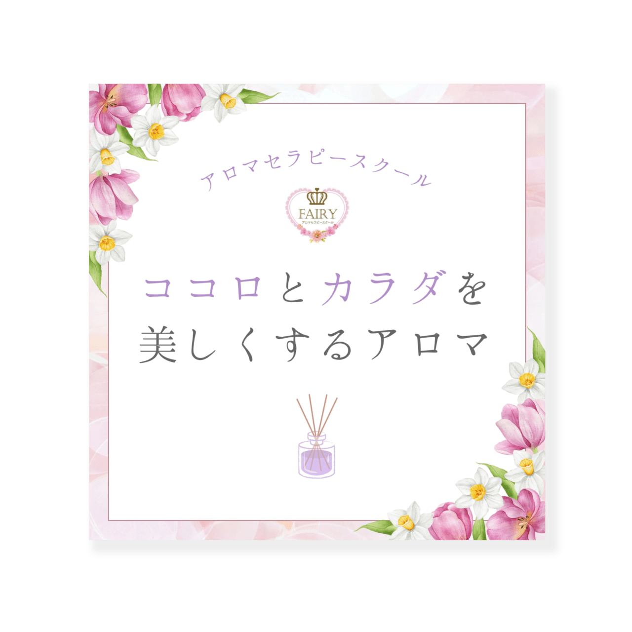 香りで願いを叶えるお教室fairy様は、毎日を快適に過ごすためのセルフケア方法が学べるアロマセラピースクールです。最高の自分になるための方法を香りで癒されながら・楽しみながら学ぶことができます。